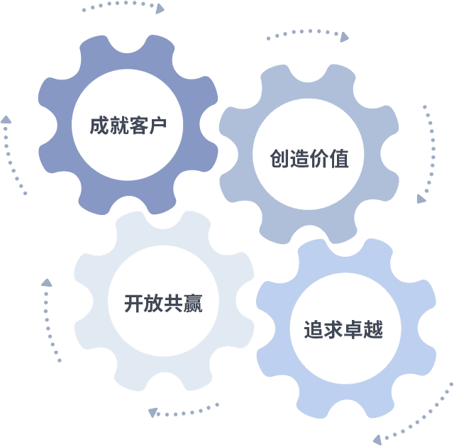 成就客户是一切决策的出发点,,,,创造价值是衡量所有工作的标准,,,追求卓越是我们做事做人的态度,,,开放共赢是我们的格局也是最终的结果。。。价值观的齿轮环环相扣,,推动着组织里的每个人不断向前。。