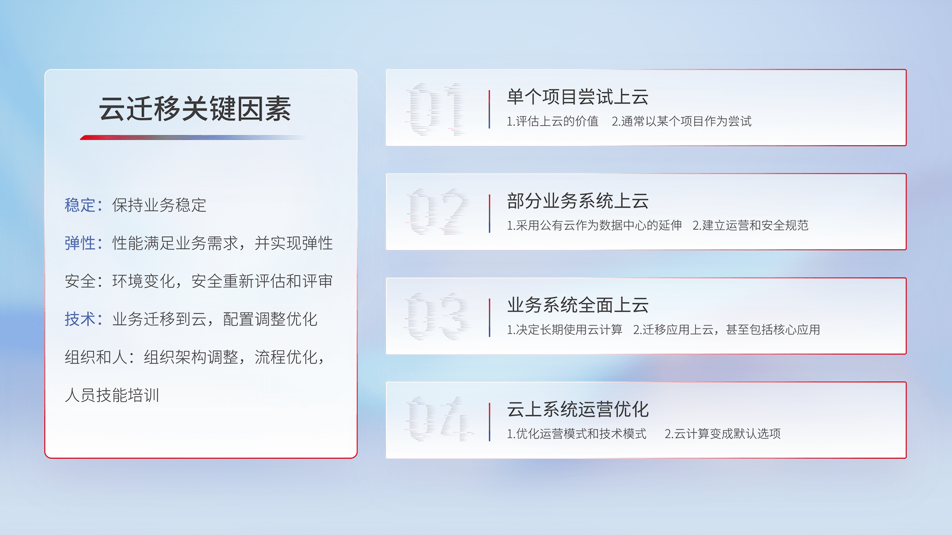 结合实际业务,,,从规划设计、、、云平台选型、、、、云原生改造、、、数据迁移、、集成交付,,迁移全过程为客户识别最佳上云路径,,做好风险识别管理,,,设计网络架构、、、身份权限、、安全审计合规、、、、操作审计、、、、日志审计、、、、监控告警策略、、、、多站点容灾设计等,,,对云上基础设施进行整体规划,,提升IT治理水平,,,,以满足弹性、、高可用、、、高性能的需求。。。